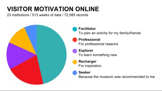 In 2015–16, Marty Spellerberg and I co-led a group of cultural organizations across the United States, joined by partners in Canada and Australia, in working together to better understand museum website visitor motivation. This was not just a research study, but a community of museums looking to better understand their online audiences through a simple online survey. The survey comprised a single question about what motivated users in going to the website that day. Focussing on identity-related motivations, rather than demographics or behaviors, the survey responses aligned with museum researcher John Falk’s Predictive Model for Museum Visitation.